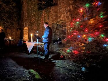 In der Ruine warteten schon zahlreiche Teilnehmende, und weitere kamen direkt vom Adventmarkt, so dass schließlich ca. 50 Personen die Andacht miteinander feiern konnten. Alle wurden mit einem Liedblatt, sowie einem Friedenslicht aus Bethlehem ausgestattet.
